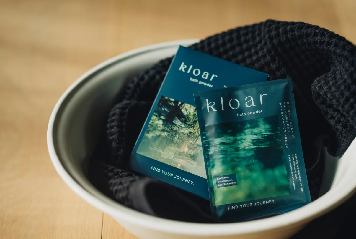 スキンオイルに続いて生まれた、Kloarオリジナルバスパウダー。湯に溶けた瞬間、黒川の露天を思わせる静けさが、ゆっくりとひらく。忙しさを脱いで、湯に身をゆだねる。今日の疲れがほどけるころ、あなたの旅は、また静かに動き出す。黒川温泉の湯と森からうまれた一包が、穏やかな夜に、そっと寄り添いますように。
